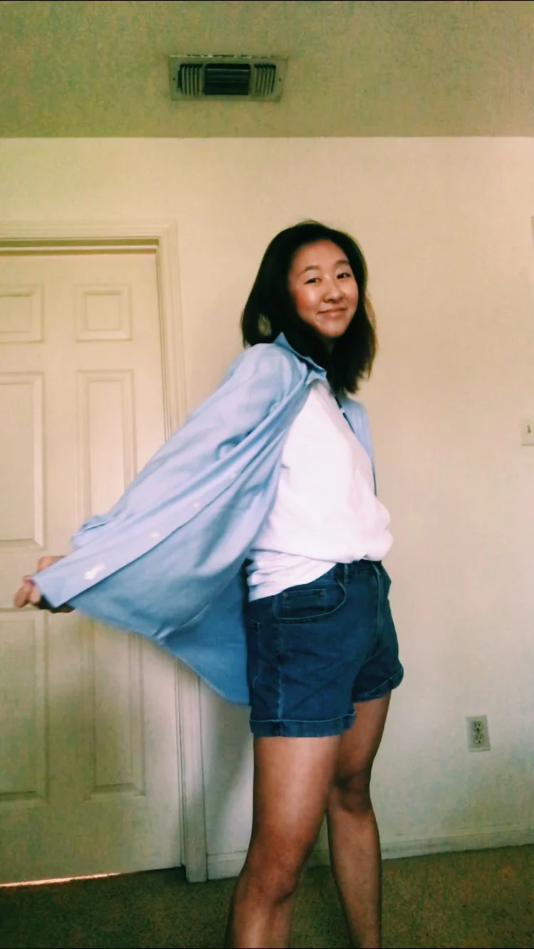 I’ve only recently started wearing my dad’s shirts this way because tbh I used to think this was such a sloppy look. But after some ~reevaluation~ I decided that I actually like this look. Perhaps because it’s so easy to put together. But I also saw a lot of people on Pinterest start to wear their oversized button-downs this way. You basically just button all the buttons and let it hang, like a dress. I still wear shorts under mine cuz it’s not long enough to cover my bottom, but if you have one that’s long enough, you can just forego the shorts completely, and it’ll really be a dress! Ofc you can’t actually wear it to a formal event, but it makes for a nice summer-y dress for going on vacay.