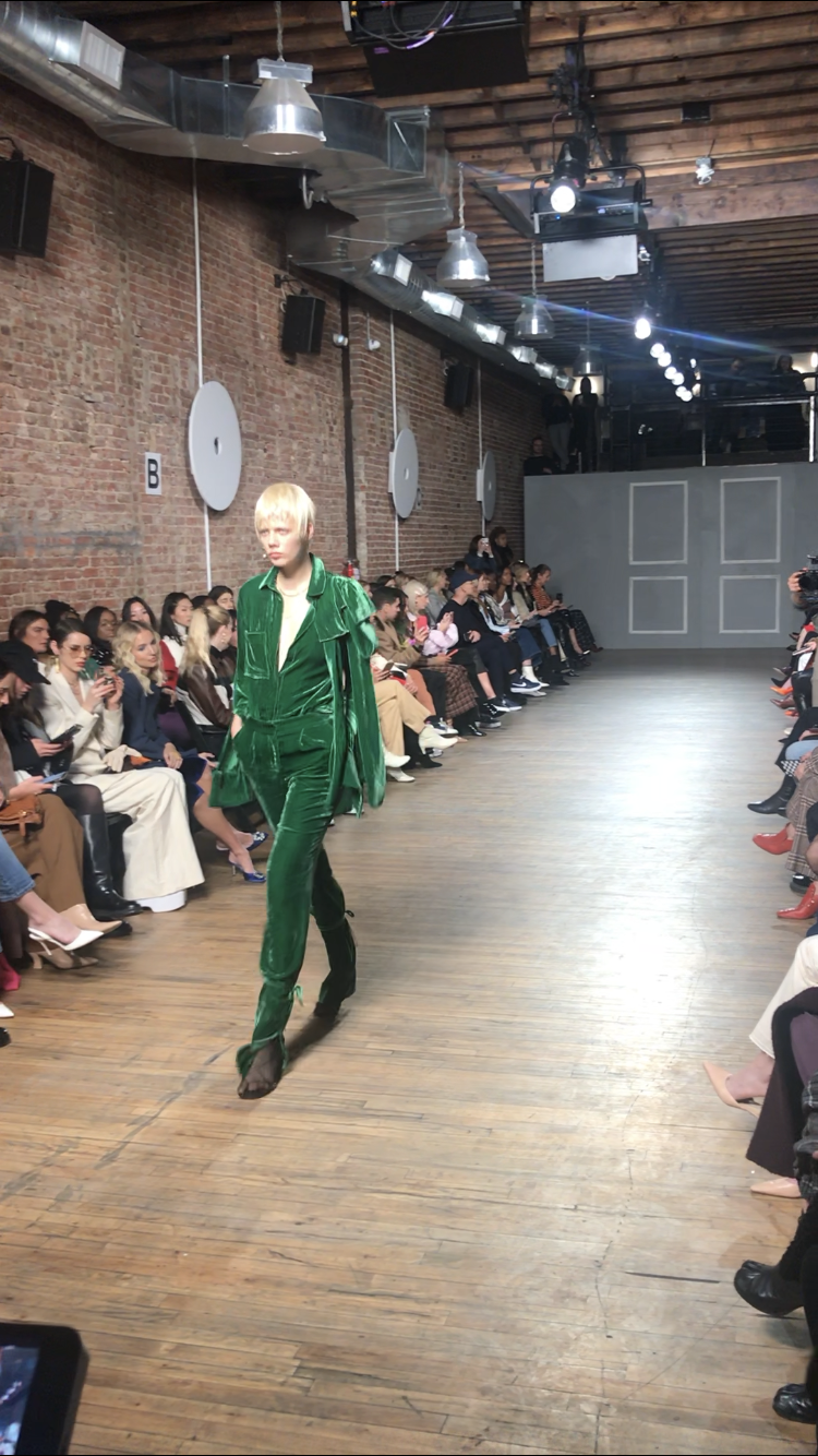 After Claudia, I got bagels again (surprise, surprise) with my friends and then I took a quick power nap before I had to head to the Hellessy show. Hellessy was at The Flat, which was a smaller, more intimate venue with exposed brick, so that was cool! For this show, I was helping guests find their seats. We also got to watch as the set came to life, but it was honestly really stressful to watch. They were running really behind schedule I think, cuz they were still trying to drill together walls, and the lady in charge was really frustrated and kept pushing the set builders to go faster. In the end, I think they were only able to finish building a part of the set, but it still looked good dw!! my favorite piece in this collection was a velvet emerald-colored ensemble, and I think they made a terrific casting choice by putting a model with pale skin and bright blond hair in that color. Also, the designer low-key gave me Victoria Beckham vibes.